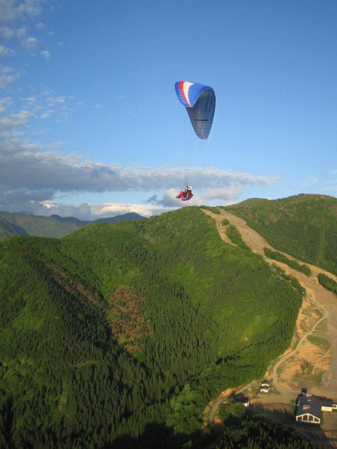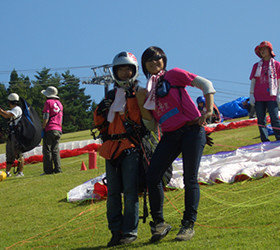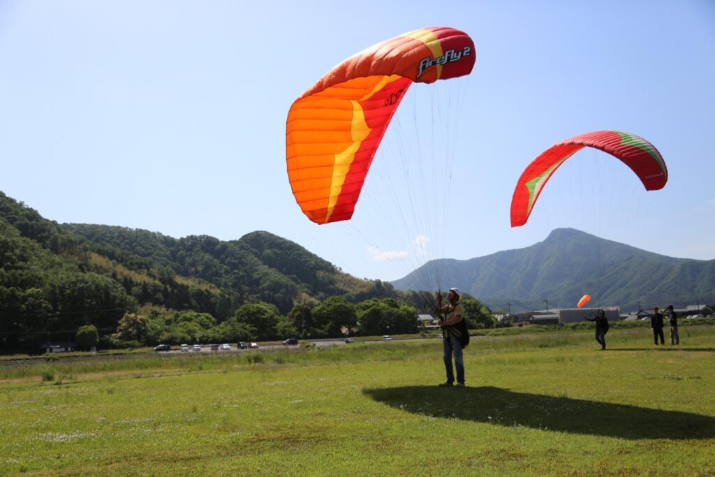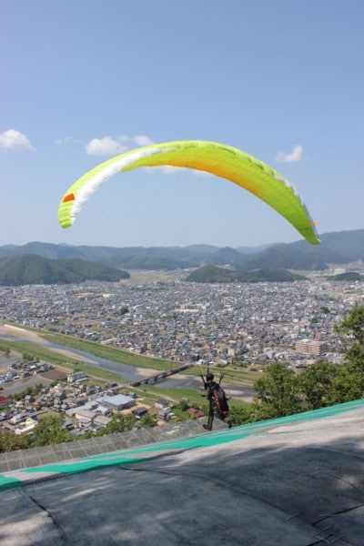 プロのパイロットと2人乗りのパラグライダーで越前市の市街地上空を遊覧飛行