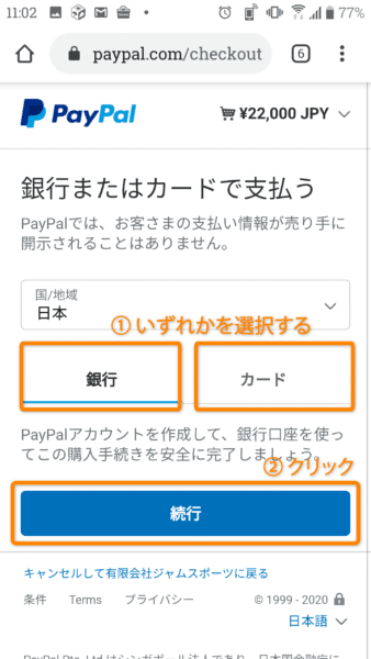 ① 下の画像に表示されている【Paypal】か【Debit or Credit Card】ボタンから決済画面へ進みます。